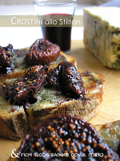 Prendete lo Stilton e rompetelo con le mani. Mettetelo su ogni crostino alternando con qualche fico. Rimettete in forno e cuocete fino a quando il formaggio non si sarà sciolto. Più o meno un paio di minuti. Bagnate con lo sciroppo al Porto e servite subito.